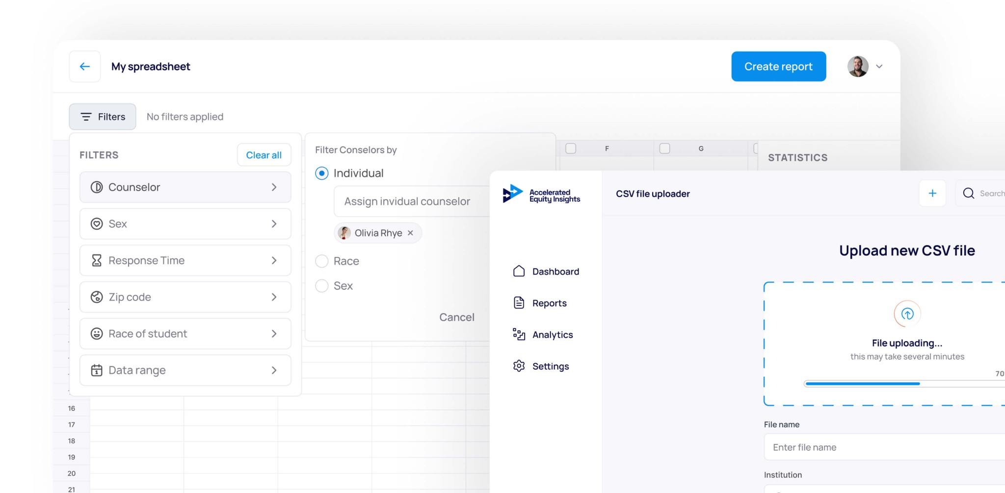 Accelerated Equity Insights works with university admissions offices to enhance and monitor communication practices, aiming to reduce bias and support more diverse incoming classes. AEI needed a centralized system that could consolidate all admissions data, evaluate critical variables, and surface insights aligned with DEI principles. Their goal was to move institutions away from scattered spreadsheets and manual analysis toward a guided digital workflow that reveals patterns, highlights potential bias, and strengthens decision-making. This new platform required clarity, nuance, and adaptability to support complex institutional needs.