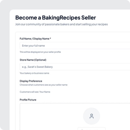 The completed marketplace delivers a comprehensive end-to-end experience for buyers, sellers, and administrators. Buyers can search recipes across categories, explore trending collections, view detailed product pages, add items to their cart, and complete checkout through multiple payment methods. Purchased recipes are saved to a dedicated library with instant PDF downloads and the ability to leave reviews. Sellers gain a structured onboarding flow, multi-step recipe creation tools, and a dashboard that consolidates recipes, orders, earnings, stats, education, and messaging. Administrators can approve submissions, review reported recipes, and monitor marketplace performance through a streamlined back office. Together, the platform provides an intuitive, visually rich environment that enables bakers to grow their businesses and customers to confidently discover and purchase high-quality recipes.