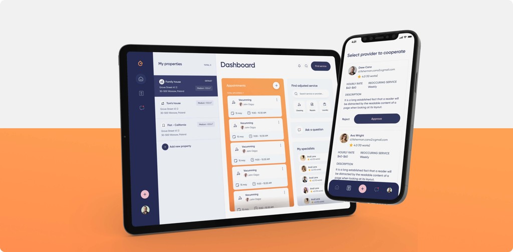 The platform required a smooth, intuitive workflow that allowed users to quickly submit maintenance needs, specify urgency, upload documents, and choose providers without friction. Designing a dashboard that housed properties, notifications, requests, and invoices, all while remaining clean and simple, was a central priority. The request process had to balance flexibility with clarity, offering a fully guided experience for describing issues and booking help. Additionally, the invoicing system needed to support organized, secure payments directly within the app, giving customers transparent real-time access to their financial activity.